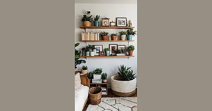 Imagine chilling in this cozy corner! It’s like a plant party met a pillow fight and decided to settle down in a super comfy nook. Seriously, those shelves are loaded with more personality than your average TikTok star! You could totally display your favorite books, those embarrassing childhood photos, or even that rock collection you forgot you had.