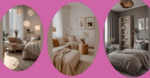Now, let’s talk about the unsung heroes of coziness: the floor squad! That big, squishy-looking pouf isn’t just a place to rest your feet; it’s practically begging you for a power nap or to be the coolest extra seat for game night. And beneath it all, the rug isn’t just keeping your toes warm; it’s like a giant, artsy splash of color and pattern that totally pulls the room together – think of it as cool artwork for your floor. Even the humble coffee table, holding books and a fancy vase, and the cool art pieces on the wall are working overtime. These ‘room decor items’ aren’t just random stuff; they’re like the secret ingredients in a super-cool recipe for a room that feels lived-in, stylish, and totally ready for your next Netflix binge or study session.