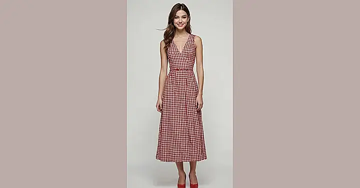 Forget what you thought you knew about picnic blankets, because this red gingham dress is here to prove that checks are for champions! Our model here isn’t just serving up a fantastic smile; she’s delivering a whole vibe in this gorgeous checkered number. With its cool V-neck and that little pop of red from the belt, it’s clear this dress is less about holding your lunch and more about making you the main course (fashionably speaking, of course!). Who knew looking this good could be so breezy?