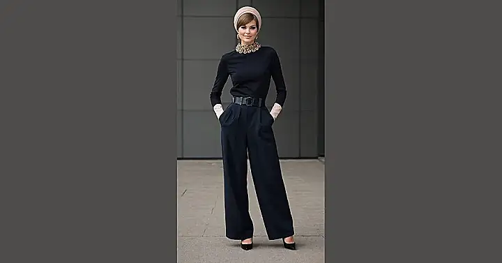 This lady is totally rocking the ’60s look! With her wide-leg pants and that groovy hat, she’s practically a time traveler from a decade where everyone wore their coolest threads. You can tell she knows what’s up! The outfit is simple but elegant, just like the ladies of the sixties who didn’t need a ton of flashy stuff to look stylish. You can practically hear the beat of a cool tune while you’re looking at this photo.