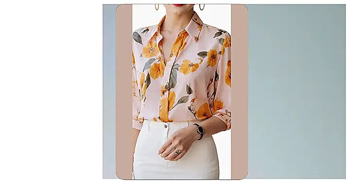 Check out this totally cheerful blouse outfit! That pink shirt covered in sunny orange flowers looks like it’s ready for a picnic or just making your day brighter. Wearing something this flowery basically means you’re bringing your own sunshine wherever you go. Pair it with some crisp white pants, and you’ve got a look that’s effortlessly cool and feels like spring break, even if it’s not.
