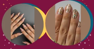 But wait, there’s more! Check out that ring finger, strutting its stuff with a dazzling golden, diamond-studded swoop that looks like it belongs on a red carpet. This isn’t just a manicure; it’s a mini-jewellery party happening right on one finger! Imagine trying to text your bestie with these on – you’d probably spend half the time admiring your own hand instead of typing. So, even if they’re not electric hot pink, these nails prove that feeling fabulous isn’t just about the color; it’s about the sparkle, the design, and knowing you’ve got something totally unique that makes you feel like the main character. Just try not to get distracted by all that shine during class!