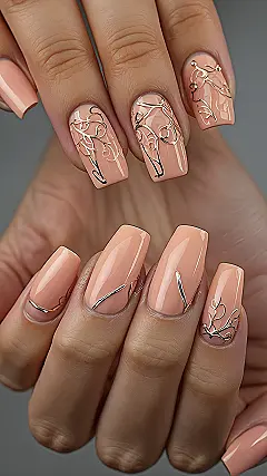Check out the wild gold designs on these peach nails! Some bits look like tiny, swirly golden vines trying to take over your nail beds, which sounds weird but looks totally awesome and delicate. Others are just slick, shiny gold lines giving things a modern edge. That gold pops against the soft peach base colour, making your nails look fancy but not like you tried *too* hard. Get ready to accidentally tap your nails on things just to admire them – it’s a totally normal reaction, we promise!