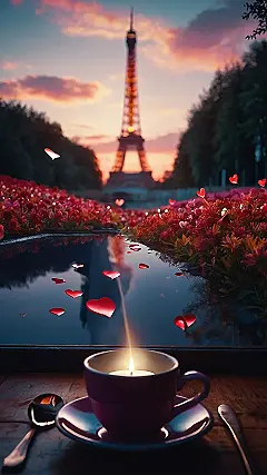 This totally adorable wallpaper is like a scene straight out of a romantic movie! Imagine this: you’re in Paris, the Eiffel Tower sparkles in the distance at sunset, and everywhere you look, there are little red hearts floating around like magic. It’s seriously dreamy, and even better, there’s a cozy candlelit teacup adding to the perfect, comfy vibe. Who needs chocolates when you have this kind of heartwarming cuteness?