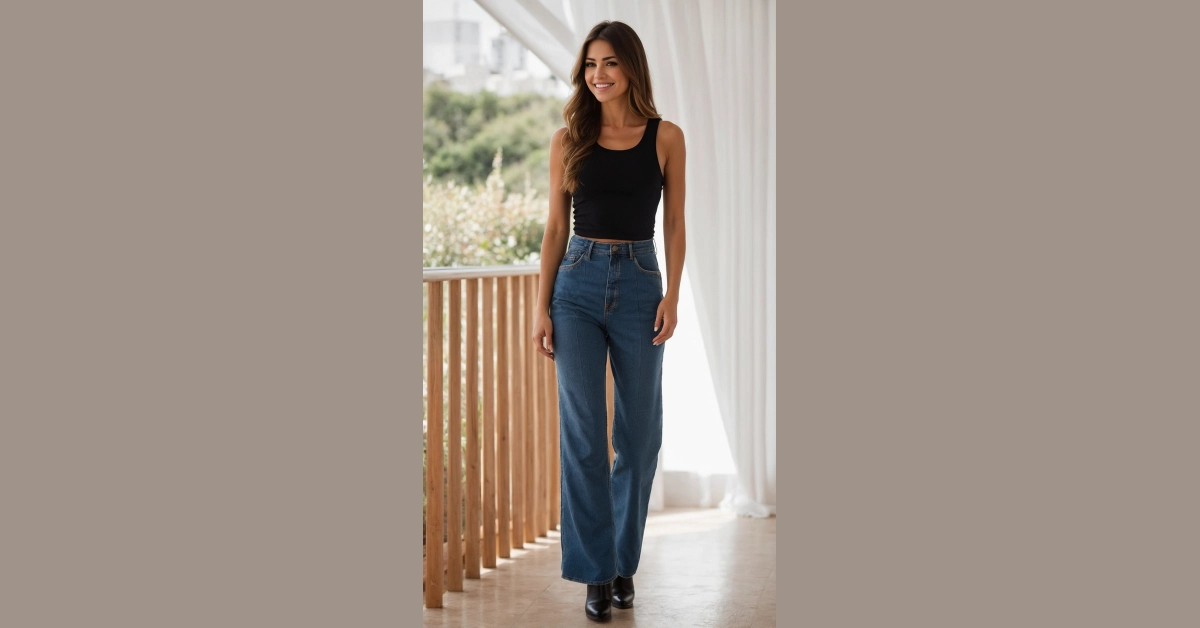 Now, let’s talk about those epic wide-leg jeans our model is rocking! Paired with that sleek black tank and a cool belt, it’s not just an outfit; it’s a whole mood. These aren’t your grandma’s stiff jeans; these are the kind you could probably do a full cartwheel in (though we don’t recommend trying that in the hallway!). It’s the ultimate ‘tank top outfit’ that screams, “I’m effortlessly chic, comfy, and probably just remembered I left my homework in my locker, but still look fabulous.” So go ahead, find your favorite tank top, pair it with some awesome wide-leg jeans, and conquer your day like the fashion legend you are!