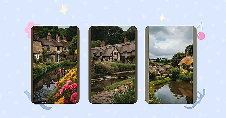 This picture makes you wish you were in a storybook! Just imagine: you’re strolling down a quiet road in an English village, the sun is warm on your face, and the air smells of freshly cut grass. The houses are cute and cozy, with thatched roofs that look like they’re straight out of a fairy tale. You can almost hear the birds singing and the sound of a gentle breeze rustling the leaves. It’s the kind of place where you can relax and forget about all your worries.