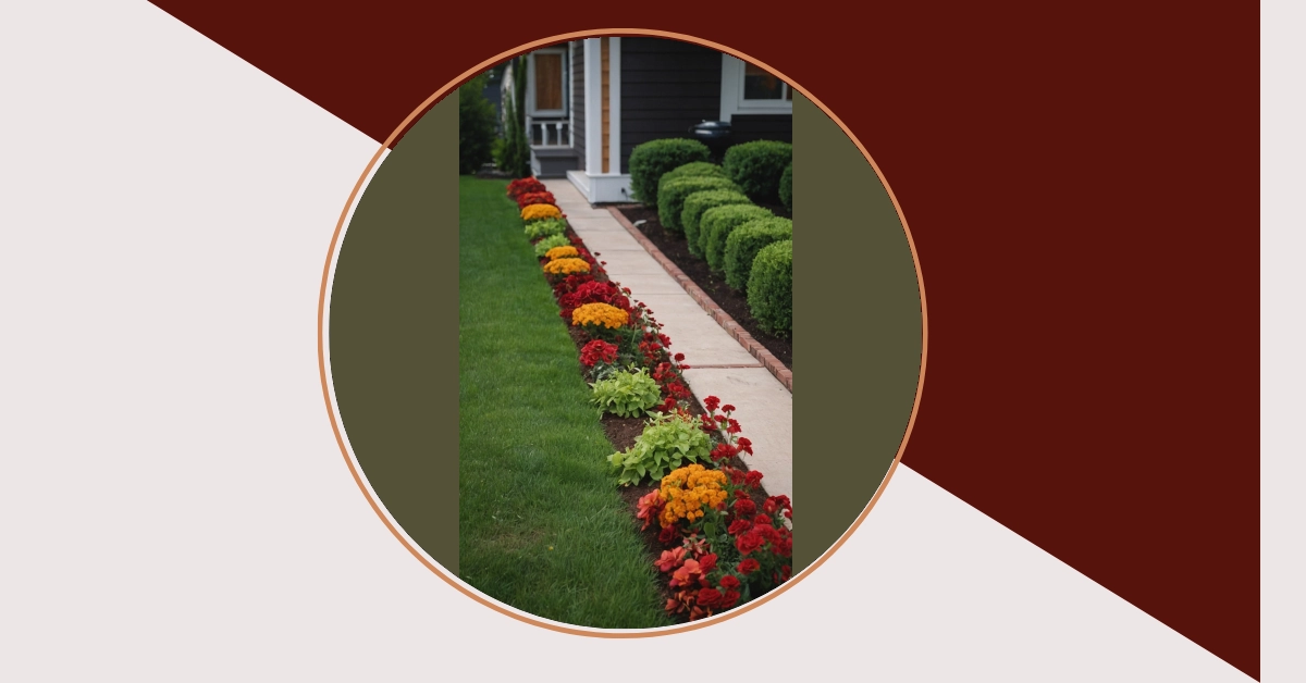 Imagine walking up to a house and being greeted by a rainbow of colors bursting from the front yard! This picture shows just that – beautiful flower beds that look like they’re having a party. You’ve got reds, yellows, and pinks all mixed together, and even some green plants for a little bit of contrast. It’s like a nature-themed art project!