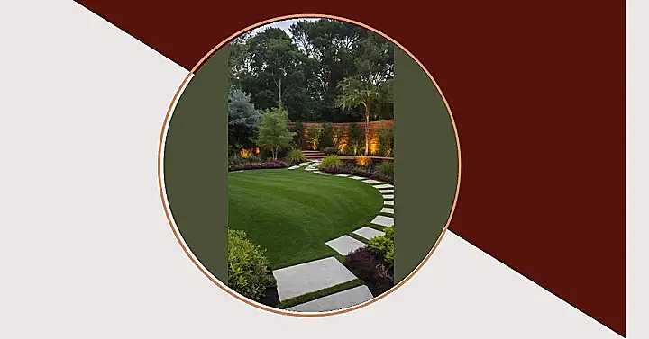 Take a look at this front yard – it’s basically showing off how to be effortlessly cool without looking like you tried too hard. That winding stone path isn’t just a walkway; it’s a golden brick road leading to adventure (or at least your front door), all lit up like a movie premiere. The whole vibe screams “minimalist,” meaning everything has its place, and there aren’t any rogue bushes trying to attack you. It’s got enough green and just a few pops of colorful flowers to make it welcoming, but not so much that you’d need a survival kit to find your way through.