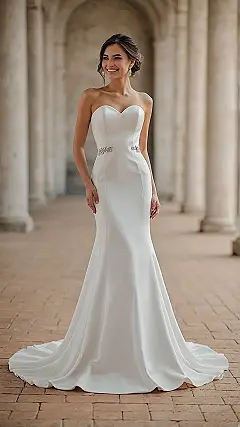 So, you see this dress? It’s like the chill cousin of those giant, sparkly wedding gowns that look like they ate a whole fabric store. This one says, “I’m here to look amazing, but I’m also pretty sure I can still sit down and maybe even bust a move without getting tangled.” It’s all smooth lines and simple elegance, proving you don’t need a wedding dress the size of a small car to feel like a queen. Plus, think of the bathroom situation – way less complicated!