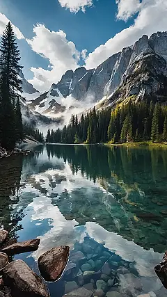 This picture is like nature’s way of saying, “Look at me, I’m awesome!” The mountains are showing off their snowy tops, the trees are doing their best to stand super straight, and the clouds are putting on a light show. But the lake? It’s the real MVP, perfectly reflecting everything like a giant, watery selfie mirror. Bet even the mountains are checking themselves out!