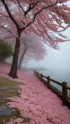 It’s almost like Mother Nature decided to have a massive pink confetti party, and she didn’t clean up afterward! The ground is totally covered in fallen blossoms, creating a magical path leading towards a mysterious, foggy river. This isn’t just any pink; it’s a special, pastel kind of pink that seems to glow even in the foggy mist, like magic sprinkled all over the place. Seriously, you could spend hours here just gazing at the beauty, feeling the peaceful mist on your face, and dreaming of pink clouds and cotton candy rivers.
