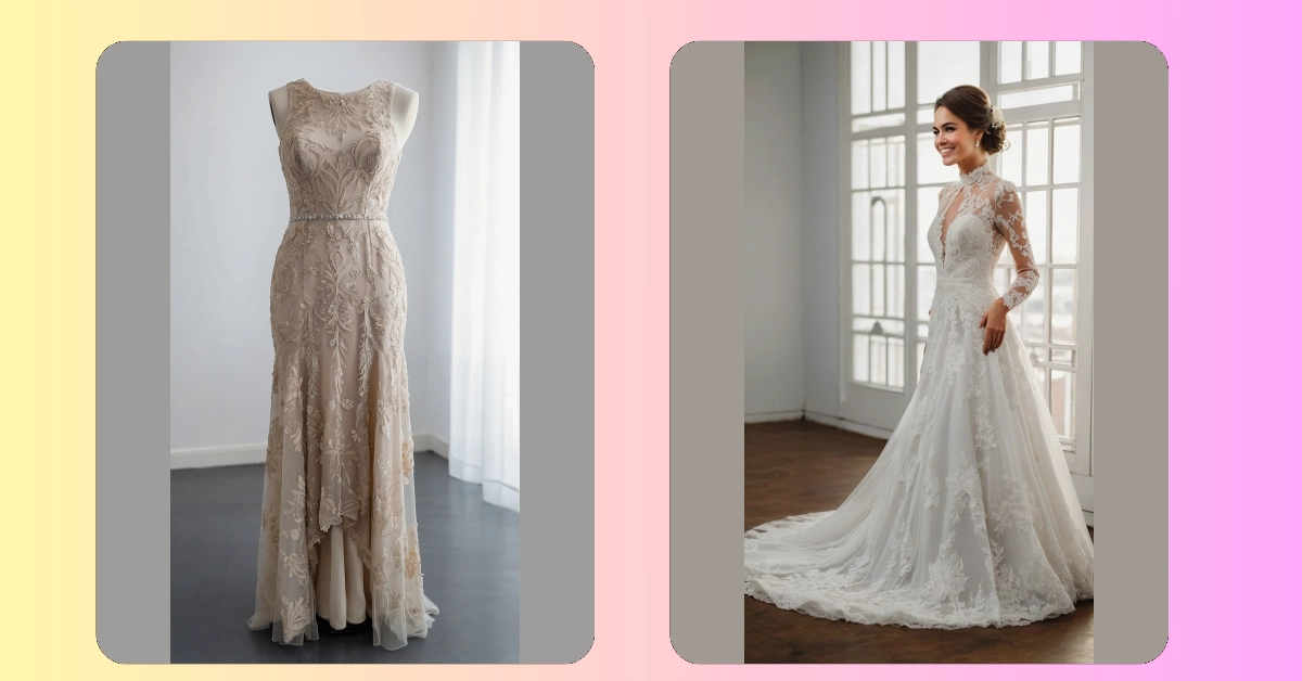 This dress is seriously princess material! The top has these delicate lace designs that make it look like you’re wearing a crown of flowers, but instead, it’s stitched right onto the dress. Then, BAM! A beaded belt cinches your waist, adding just the right amount of sparkle, kind of like adding the perfect filter to your wedding pics before posting them!