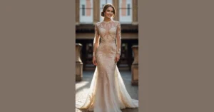 Forget boring old pure white! This dress right here is like the cool older cousin of a traditional wedding gown, rocking a super chic, soft blush or champagne color. It’s not screaming “look at me, I’m pink!” but it definitely gives off a vibe that says, “I’m classy, but I also like to have a little fun.” Plus, let’s be real, a slightly colored dress probably hides any accidental cake smudges a tiny bit better than dazzling white. It’s perfect for anyone who wants to ditch the ‘snow queen’ look and embrace something a little warmer and unique without going full-on rainbow.