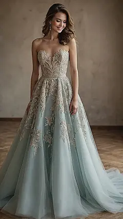 Let’s be real, a lot of wedding dresses look like they got lost in a snowstorm. But then there’s this stunner, ready to totally flip the script! With its incredible mix of soft ivory lace up top and a dreamy pale blue skirt, this dress isn’t just saying ‘I do,’ it’s saying ‘I do, in style!’ If you’ve ever thought about ditching the all-white tradition, colored wedding dresses like this one prove you can totally be unique and still look absolutely gorgeous. Forget blending in; this dress is practically a masterpiece that screams, ‘Guess what? I brought the party AND the ocean vibes!’