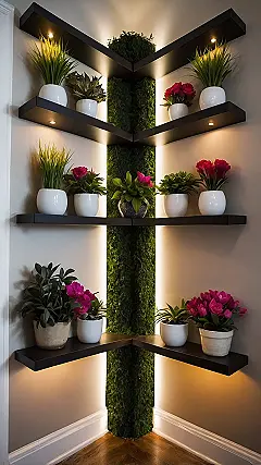 And let’s not ignore the magnificent mossy green column holding it all together, looking like a fuzzy, living wallpaper or maybe a secret garden elevator for tiny fairies. This whole setup brings serious cool points to any room, turning a boring ninety-degree angle into a vibrant, lit-up display. If you’re tired of your phone charger being the most exciting thing in your room, these corner shelves, loaded with lush greens and bright flowers, are basically an instant mood boost that says, “Hey, this room is fun!”