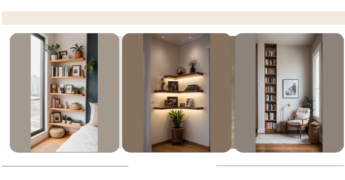 You know how sometimes your room has those awkward corners? The ones that usually just collect dust bunnies, or where your phone charger mysteriously disappears forever? This picture shows how to totally transform those forgotten nooks! These slick corner shelves aren’t just for holding stuff; they’re like giving your room an instant upgrade, making even the most neglected spots look super stylish and functional. It’s basically a genius hack to squeeze more awesomeness into your space without making it feel cluttered.