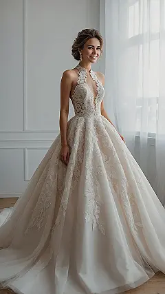 This dress totally changes what you think ‘modern minimalist’ means, right? We’re pretty sure “minimalist” in this case translates to “just enough sparkle and gorgeous detail to make everyone do a double-take.” The delicate lace on the halter top and deep V-neck is so beautifully designed, it’s like a fancy secret code for “I’m chic and I know it.” This look is basically a masterclass in looking effortlessly stunning, while secretly being the undisputed main event of any room you float into.