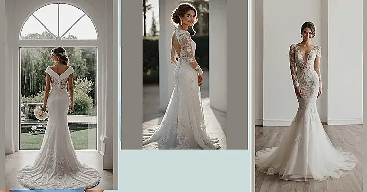 Check out that fancy lace on the sleeves and around the neck! It’s not just lace; it’s like a secret handshake between elegance and a little bit of sass, giving you that ‘wow’ factor without going overboard. The way this dress hugs the body and then gently flares out at the bottom? That’s not just a dress; that’s a red carpet moment waiting to happen, ensuring you’ll float down the aisle looking like a total superstar, not a marshmallow. Plus, with a skirt this gracefully flowing, you can ditch the fear of getting tangled up and just focus on saying “I do” and maybe sneaking an extra piece of cake (we won’t tell!).