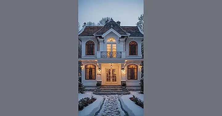 This French cottage house exterior looks like it just landed from a fancy movie scene, sitting all pretty and glowing in the snow. It’s so bright and inviting, it practically shouts, “Come in, where it’s warm!” If my actual idea of a simple ‘cottage’ involved a tiny hut, this one must have gone to finishing school in Paris. Look at those windows and that balcony! You half expect someone to lean out and dramatically declare their love, probably in French, while you’re just trying to clear the snowy path for the pizza delivery guy.