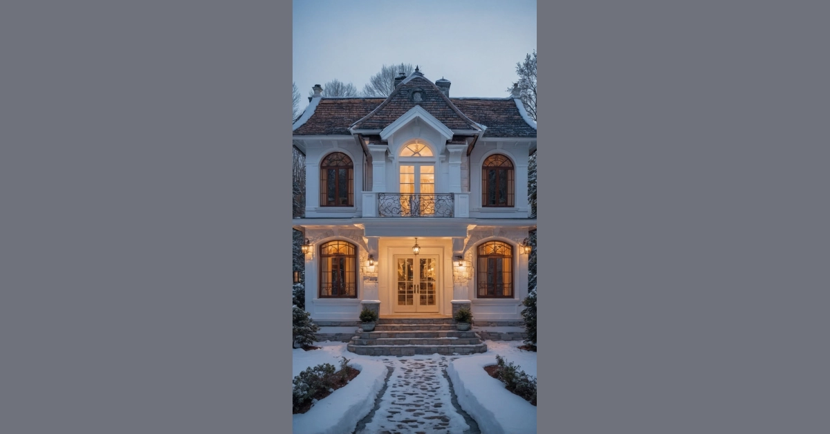 This French cottage house exterior looks like it just landed from a fancy movie scene, sitting all pretty and glowing in the snow. It’s so bright and inviting, it practically shouts, “Come in, where it’s warm!” If my actual idea of a simple ‘cottage’ involved a tiny hut, this one must have gone to finishing school in Paris. Look at those windows and that balcony! You half expect someone to lean out and dramatically declare their love, probably in French, while you’re just trying to clear the snowy path for the pizza delivery guy.