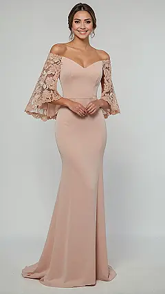 Hold the gold bars! While we might have mentioned ‘gold wedding dress,’ this absolute stunner in a gorgeous peachy blush proves you don’t need actual treasure to look like a million bucks. Seriously, check out those awesome off-the-shoulder sleeves with all that fancy lace – it’s like a fairy tale decided to have a super stylish, non-gold moment. You’d totally glide into any fancy event, or even just your living room, looking absolutely radiant and ready to make heads turn.