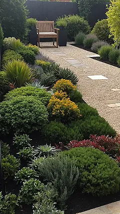 Walking past this front garden landscape feels less like a casual stroll and more like a trip through a meticulously curated plant runway. Every single bush, succulent, and leafy green looks like it just got back from a spa day, perfectly trimmed and glowing. You can almost hear the plants whispering, “Look at us! We’re coordinated!” The neat gravel path with its clean stepping stones just begs you to wander in, probably leading you to that super comfy-looking wooden bench where you could just chill and pretend your biggest problem isn’t that essay due tomorrow. It’s so tidy, you half expect a tiny garden gnome butler to pop out and offer you a refreshing beverage.