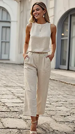 Let’s be real, trying to look cute when it’s hot enough to melt pavement is a challenge. Regular pants feel like sticky oven mitts on your legs. That’s where the magic of a great linen pants outfit comes in! Look at this picture – those white linen pants just scream “I’m cool and comfortable, even if it’s ninety degrees.” Linen is like the superhero fabric of summer; it lets your legs breathe instead of feeling like they’re trapped in a sauna. Plus, a few wrinkles? That’s just proof you’re living your best, breezy life, not a sign you forgot how to iron!