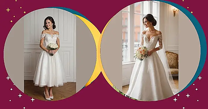 Ready to ditch the drama of super-long gowns? This incredible modern minimalist wedding dress is basically the grown-up, ultra-chic version of your favorite party dress. With its breezy length that means zero tripping hazards (score!), and gorgeous off-the-shoulder lace, our bride here looks like she’s about to float down the aisle *and* then own the dance floor. Plus, think of all the delicious wedding cake you can secretly sneak while twirling without a huge train getting in the way! This dress says, “I’m fabulous and I’m ready for fun.”