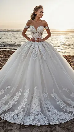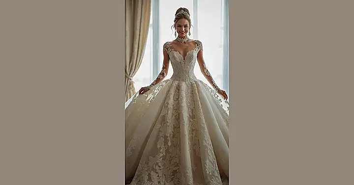 Thinking about dream wedding dresses can get pretty wild, right? This dress in the picture is basically the final boss level of ‘dreamy.’ It’s got enough lace to cover a small house and a skirt so big you might accidentally sweep the floor cleaner than the cleaners. You put this on, and suddenly you’re not just walking, you’re gliding… or maybe wobbling slightly under the weight of looking this amazing. It’s definitely the kind of dress you fantasize about, just maybe keep an eye on where your feet are going!