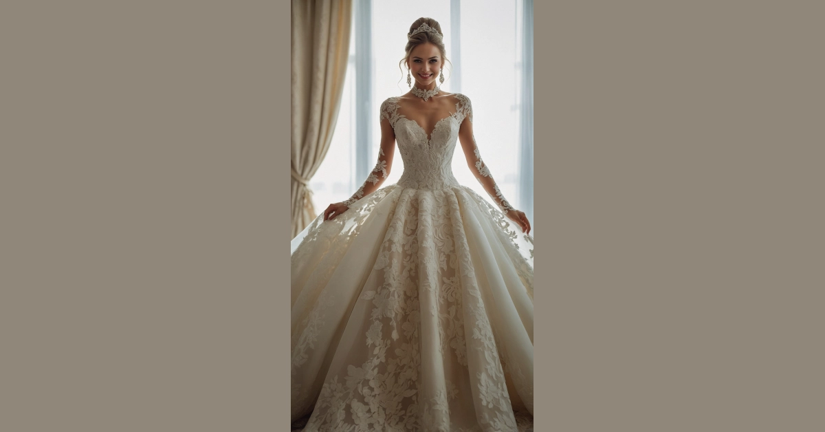 Okay, let’s be real, scrolling through pictures of dream wedding dresses like this one is basically a sport at this point. You see that gorgeous lace bodice and those long sleeves? It’s like something straight out of a fancy movie, making you wonder if Cinderella had this much sparkle. And the skirt! It’s so full and flowy, you’d probably need a small village to help you manage that train down the aisle. Just walking in it would make you feel like total royalty, minus the awkward waving and strict curtsy rules, of course.