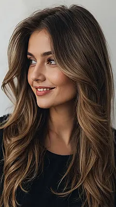 Speaking of superpowers, a layered cut, like the one rocking in this photo, isn’t just about volume; it’s about looking effortlessly cool. Notice how those beautiful highlights get to shine and swirl around, creating all that amazing depth? Layers are like the perfect stage crew for your hair, making sure every strand gets its moment in the spotlight. Whether you’re aiming for those bouncy waves or just want your hair to feel lighter and move more freely, layers transform it from a one-hit wonder into a full-blown album of amazing looks. It’s the secret ingredient for hair that always looks like it just had a fantastic day, even if you just rolled out of bed five minutes ago!