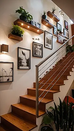 Tired of staring at a blank wall that looks like it’s silently judging your life choices? Giving your apartment walls a glow-up is way easier and more fun than it sounds! Just check out this awesome staircase area – those floating wooden shelves, complete with cool plants and tiny spotlights, make a huge difference. It’s like turning a plain white canvas into your own personal gallery, but instead of fancy art critics, you get to impress your friends and maybe even your pet goldfish. Adding these simple touches can completely transform a boring space into something vibrant and full of personality.