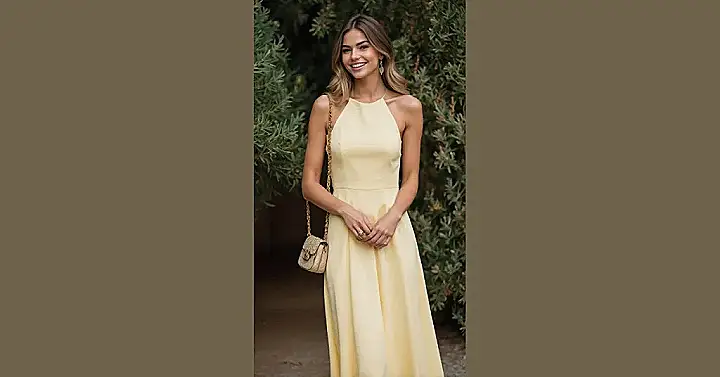 Styling a dress this charming is actually super fun because the dress already does half the work for you! Our model friend proves that delicate, sparkly earrings are the perfect match for that open neckline, adding a touch of glam without overpowering the main event (which is you, obviously!). Keep the rest of your accessories light – maybe a simple bracelet or ring – to let that butter yellow pop. And for shoes? Nude heels are always a win for elegance, or if you’re feeling extra sparkly, some metallic sandals would look amazing. Just try not to get mistaken for the prettiest scoop of lemon sorbet, though we wouldn’t blame anyone for wanting a taste of your amazing style!
