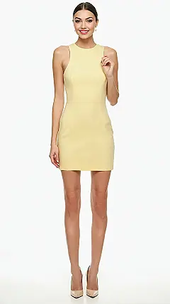 Thinking about how to rock this butter yellow beauty? The model here is crushing it with simple, sleek hair and those classy nude heels – it’s like she’s saying, ‘I woke up like this, and I look fabulous.’ For your own superstar moment, try pairing it with some minimalist earrings, maybe a cute bracelet, and some comfy sneakers for a casual vibe (because who wants sore feet?). Or, if you’re aiming for full glam for a school event, those heels are definitely a vibe! Just remember, the secret ingredient is always that big, confident smile, just like hers, which makes any outfit 100 times better.