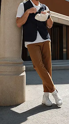But let’s not forget the details that make this whole pants outfit for men pop! Notice how the pants are perfectly cuffed, showing off those fresh white sneakers and socks? It’s a move that says, “I pay attention to style, but I’m also ready to sprint if a pizza truck drives by.” The vest adds a layer of “sophisticated casual,” which is a fancy way of saying he looks dressed up without actually *trying* to look dressed up. This combo of brown pants, white tee, and a vest is so versatile, you could wear it to school, a casual hang-out, or even trick your grandparents into thinking you’re super responsible. Just make sure your leaning game is as strong as his!