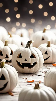 These jack-o’-lanterns are ready to party! They’re not your average orange pumpkins, though. These guys are all decked out in white, looking spooky and stylish at the same time. Imagine walking down a dark street, and suddenly, these glowing white faces pop out at you! They’re like ghosts that decided to dress up as pumpkins.