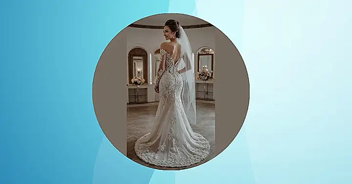 Wearing a dress like this trumpet style isn’t just about looking good; it’s about making an announcement, loud and clear – like a whole brass band! With all that spectacular lace and the way the skirt swooshes out, you can practically hear the “ta-da!” as she walks. She probably feels like she could float down the aisle or maybe even bust out some epic dance moves (carefully, of course, because that stunning train deserves its own spotlight!). Talk about being ready for your close-up, no matter which way you turn!