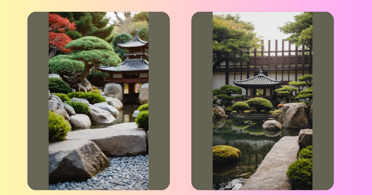 This picture shows a Japanese garden, and it’s way cooler than your average backyard. There’s a cute little bridge, a pond, and all sorts of carefully placed rocks and trees. It’s like a miniature world where everything is perfectly balanced. You can practically hear the sound of nature and feel the peacefulness just by looking at it.