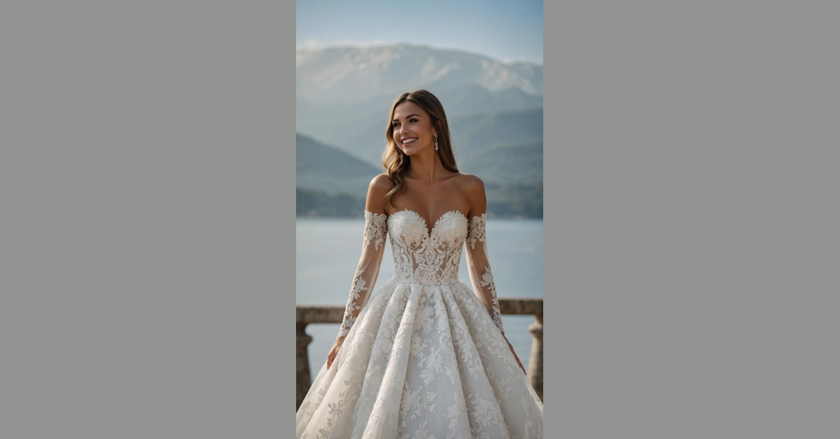 Who knew a wedding dress could look this ready for a red carpet *and* a mountain adventure? This lady is absolutely glowing, probably because she’s rocking a dress that makes even those majestic mountains in the background look a little bit jealous. With that gorgeous, structured bodice creating a super flattering shape – we’re talking full-on Basque waist vibes here, where it just dips perfectly to give that elegant, elongated look – you know she feels like a total queen. Plus, those sheer lace sleeves are so delicate, they practically float! This dress probably has more layers than my history textbook, but in a much more exciting way.