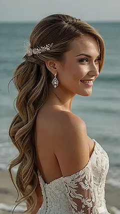 This gorgeous hairstyle is perfect for bridesmaids with long hair who want to look amazing without spending hours in the salon. Imagine rocking those loose, romantic waves on the beach, looking like a total princess (but a fun, chill princess, not a stuffy one!). The delicate hairpiece adds a touch of sparkle without being over the top—it’s the perfect mix of elegant and easy-going. Plus, this style is versatile; it would look stunning at a fancy wedding or a laid-back beach ceremony!