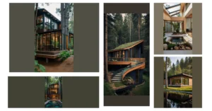 Those gigantic windows aren’t just for looking pretty; they’re practically inviting the whole forest indoors for a tea party! You can almost see yourself lounging on those super comfy-looking couches inside, probably sipping on something fancy while a deer stares back at you from the yard, wondering how you got such a cool pad. It’s the kind of place where you’d never have to wonder if it’s sunny outside because the entire wall would tell you. Plus, think of all the natural light for your TikToks – no ring light needed when your house is this bright and airy!