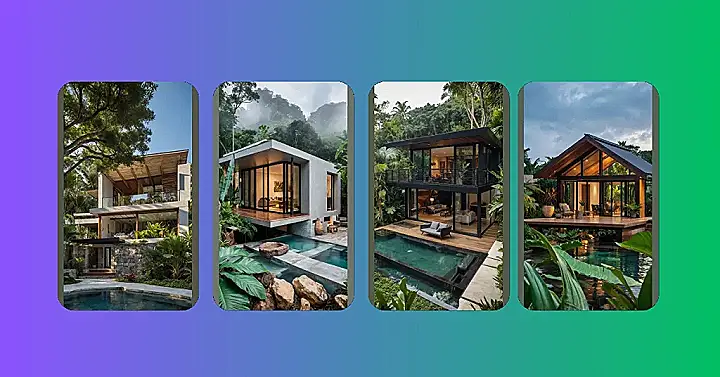 This house looks like it grew straight out of the jungle, ready for some serious chill time. It’s got these massive glass walls everywhere, like someone forgot to put the blinds up, but in the best way possible. You could literally be sipping juice inside and feel like you’re part of the wild crew outside, maybe waving hello to a parrot or two. It’s the ultimate blend of fancy modern living and “oops, did I just see a lizard on the wall?” adventure.