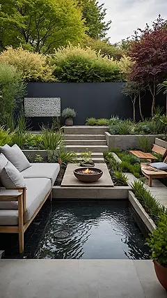 This picture proves you don’t need a massive park to have a seriously awesome outdoor space. Think of this small garden design as the superhero of tiny yards, cramming in maximum cool points. You’ve got a little water feature that probably makes calming gurgling noises, a fire pit ready for late-night chats or maybe even illegal s’mores, and seating that looks way more inviting than your couch indoors. It’s like they took a regular backyard and shrunk it with a cool-ify ray, ending up with a mini oasis perfect for pretending you’re on vacation.