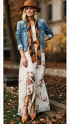This outfit is giving “fall vibes” with a capital V! It’s like a picture perfect day at a winery, where the air is crisp, the leaves are changing, and the wine is flowing. The floral skirt adds a touch of elegance and whimsy, while the denim jacket keeps things casual and cool. The scarf is the perfect pop of color to add some extra personality. Plus, those brown shoes? They’re literally the definition of “fall fashion goals”.