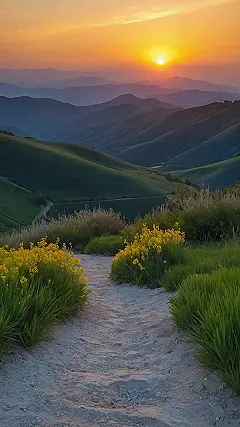 Imagine strolling down a sandy path, the sun painting the sky in fiery oranges and soft pinks. It’s like nature decided to throw a super chill sunset party, and these rolling hills are the VIP section! The whole scene is seriously peaceful, like a postcard come to life – even the little yellow flowers seem to be whispering secrets of serenity. You could totally meditate here, or just pretend you’re a character in a super peaceful movie.