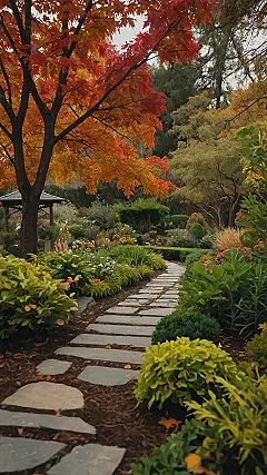 This picture is like a sneak peek into a magical autumn garden! It’s full of vibrant colors – like a mix of red, yellow, and green paint splattered on the leaves. You can almost feel the crisp autumn air as you walk on the stone path, surrounded by the changing foliage.