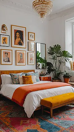 Step into this bedroom, and you might think a rainbow exploded, then an art gallery decided to crash the party, and honestly, we’re here for it! This isn’t just a room; it’s a full-blown visual feast where ‘less is more’ clearly got lost on the way. Check out that epic gallery wall, packed with so many framed treasures it’s practically a museum exhibit dedicated to coolness. Every single picture tells a story, and together they create a vibe that screams ‘I’m fabulous, and I know it’ – which is totally the energy we all need for our morning routine!