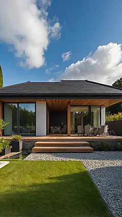 And speaking of chilling, that outdoor dining spot under the beautiful wooden ceiling? Prime real estate for epic board game tournaments, or maybe just devouring pizza with your squad while pretending you’re way more mature than you are. Plus, with the sun shining and those fluffy clouds looking like giant cotton balls, this place screams “no drama, just good vibes.” It’s the kind of house where even doing chores would feel less like a punishment and more like an outdoor adventure, especially if it involves watering those cool plants or raking the pebble path for extra crunch.