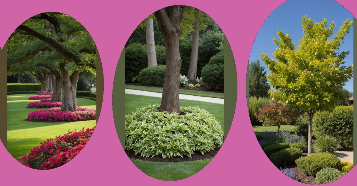 Check out how these plants aren’t just thrown anywhere! They’re all clustered around the base of the bigger green guys, kind of like giving the trees their own personal fan club or maybe a fancy skirt. This ‘base of tree landscaping’ thing is basically like dressing up the bottom of your favorite tall friend so they don’t look like they’re standing awkwardly alone in the grass. It makes everything look way more put together, like the tree finally got its accessories right and is ready for its close-up in the yard.