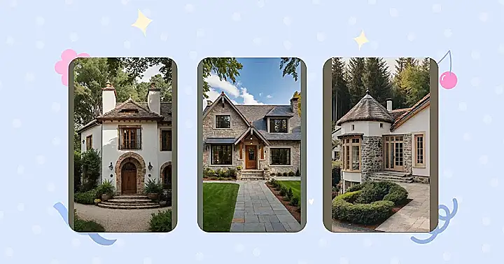 Zooming in on the details, that arched front door looks like it’s waiting to welcome you into a world of cozy fireplaces and delicious smells. Those tiny, pointed windows up top give it a playful, almost cartoonish vibe, like little eyes peeking out. Even the pathway winding up to the steps feels like it’s leading somewhere special. It’s the kind of house that makes you want to ditch your phone, grab a book, and just chill on the porch, pretending you’re far away from homework.